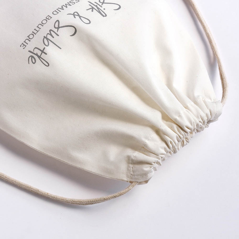 The 145 gsm (4.5 oz) fabric weight is built to last.  The bags have double drawstrings for easy open and close