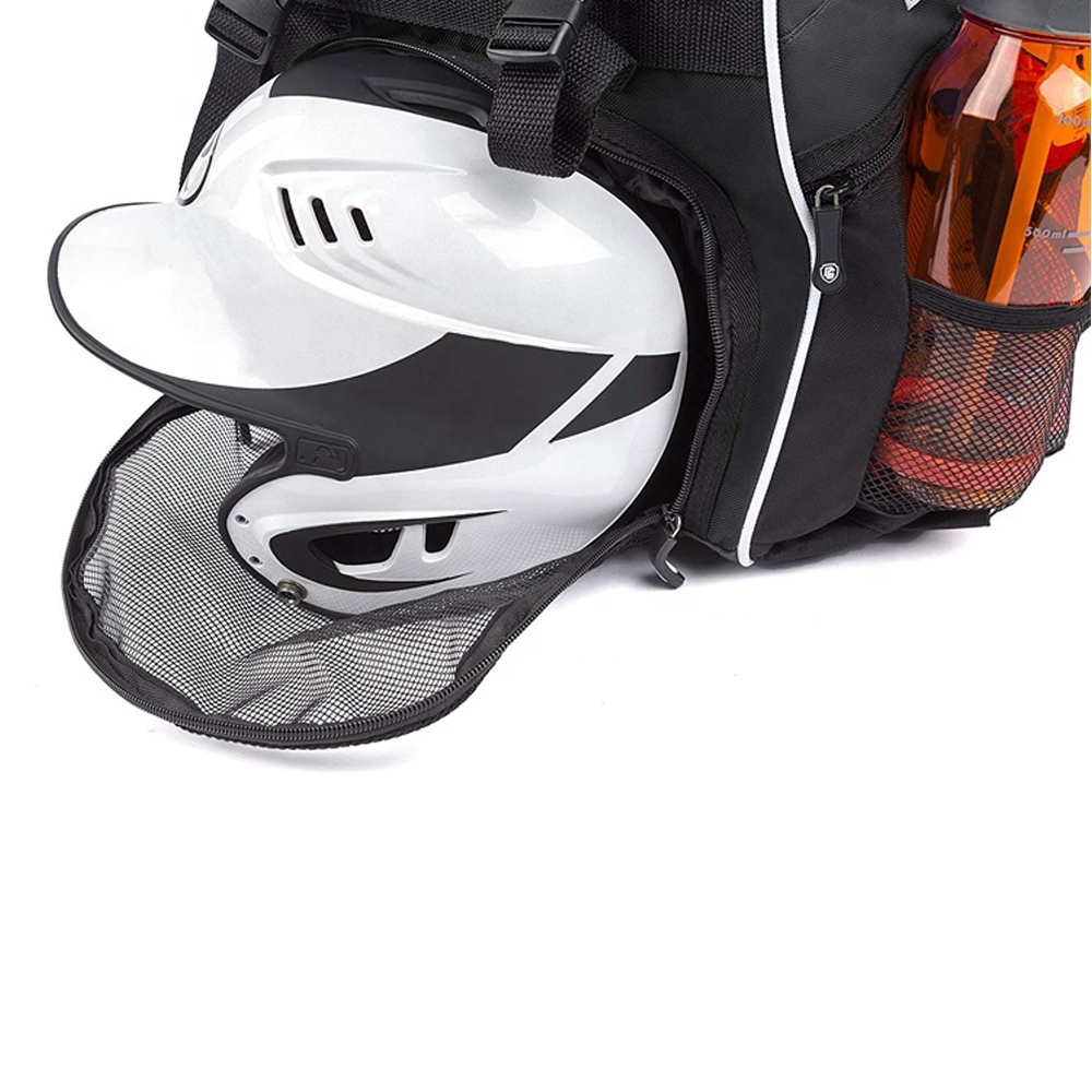 Our baseball bags store two bats, a baseball helmet, batting gloves, cleats, baseball cap, and catching glove.